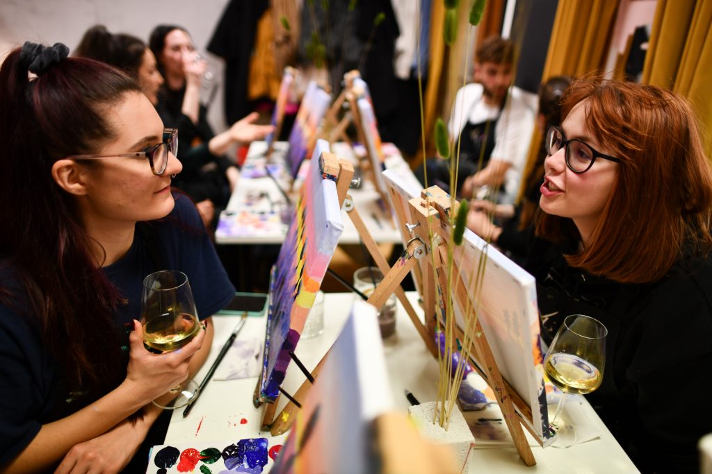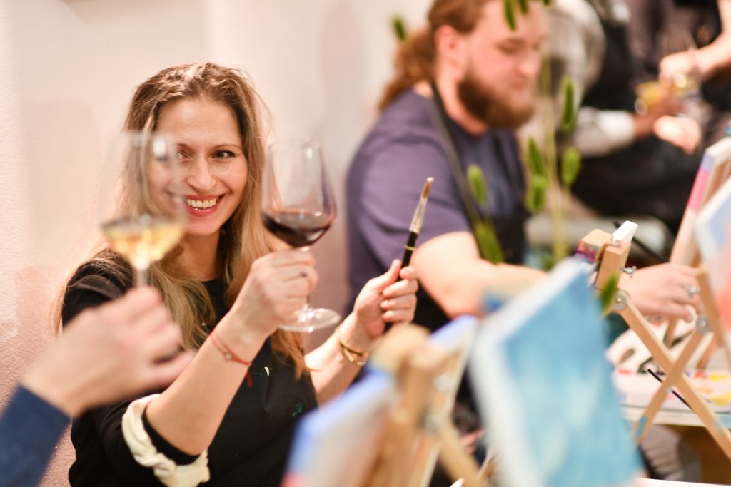 The instructor guides you through the chosen motif step by step. There is no rush and no right or wrong — just relaxed creativity, good company and a pleasant glass of wine to keep the inspiration flowing. The atmosphere is social, informal and easy-going, making it perfect for an after-work escape or a different kind of evening out.